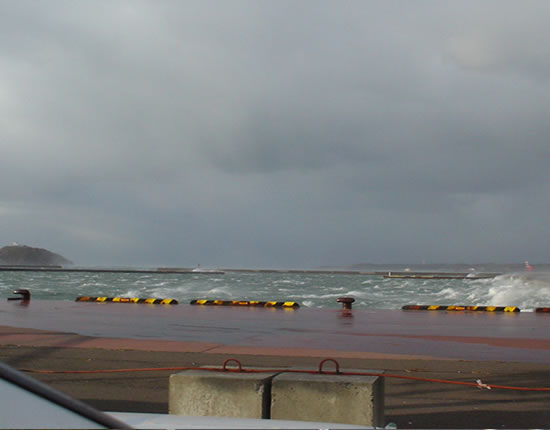 | 11月27日 朝から台風並の暴風で白鳥大橋通行止めでした。 年に何度か通行止めになるのですが・・ 門が閉じ面ですね〜。 初めてだったので・・ 写真取りました。 |