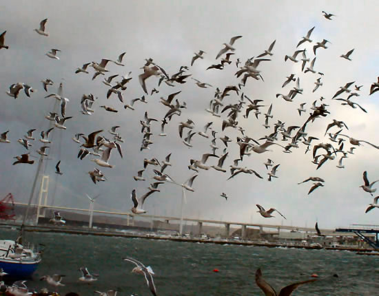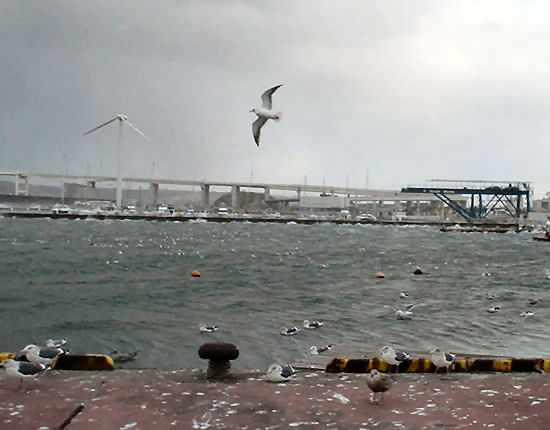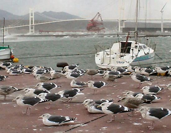 | かもめもこの暴風で団体で休んでるところを写真を撮りに行きましたらびっくりした様で・・いっせいに飛んでしまいました。。 しかしこの暴風でも飛べるんですね〜。 |