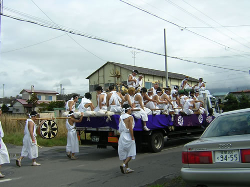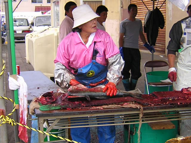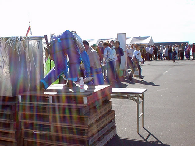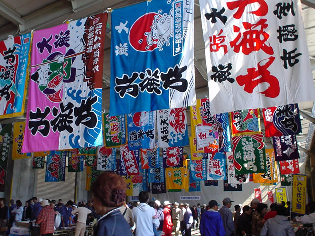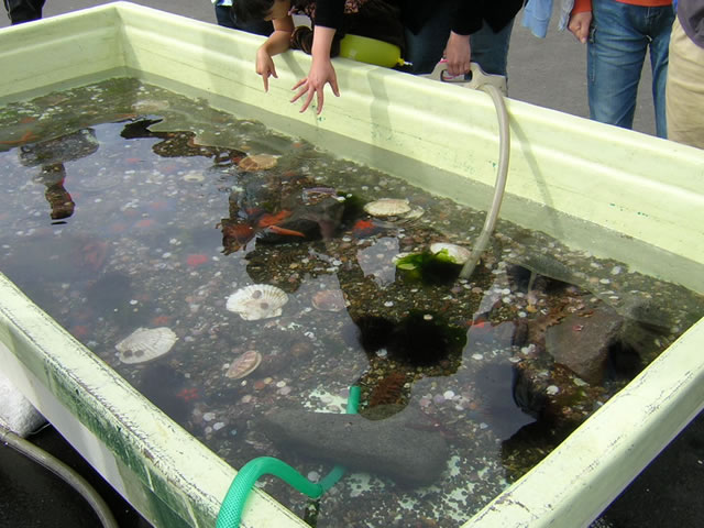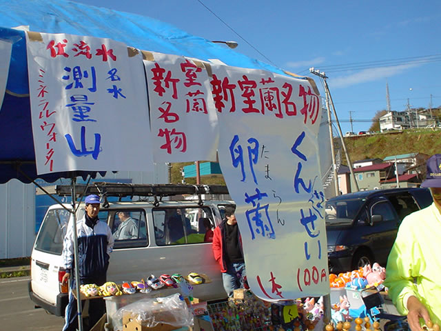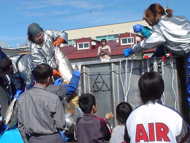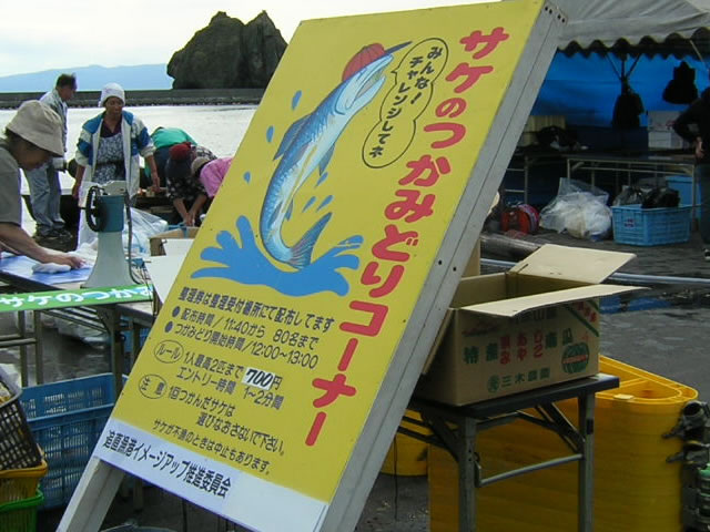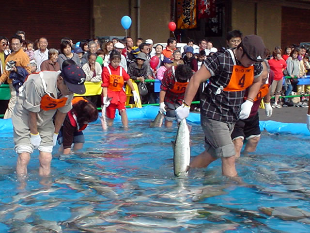 | 10月3日 第11回室蘭さかなの港町同好会が追直漁港で開かれました。さけの棒引きには長蛇の列で一回700円で大きなメスのサケ一匹とか4匹も紐に付いてて引いた方もびっくりでした。サケのつかみ取りも700円で2匹まで、着替えまで用意して、毎年の魚の町同窓会のイベントを楽しみにしてるようでした。 |